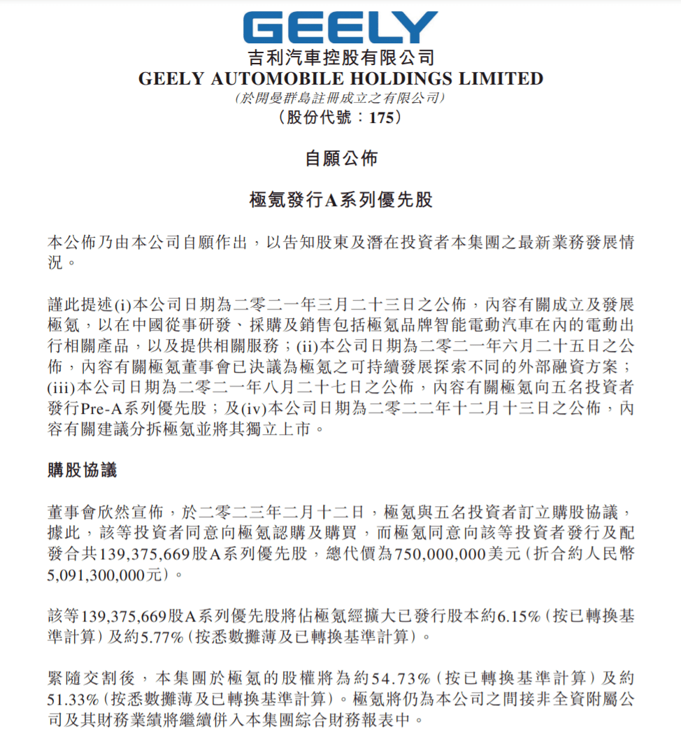 最后的故事则是一条融资消息,吉利旗下的高端新能源品牌极氪,收获来自宁德时代等5家机构的7.5亿美元A轮融资,投后估值上升至130亿美元。