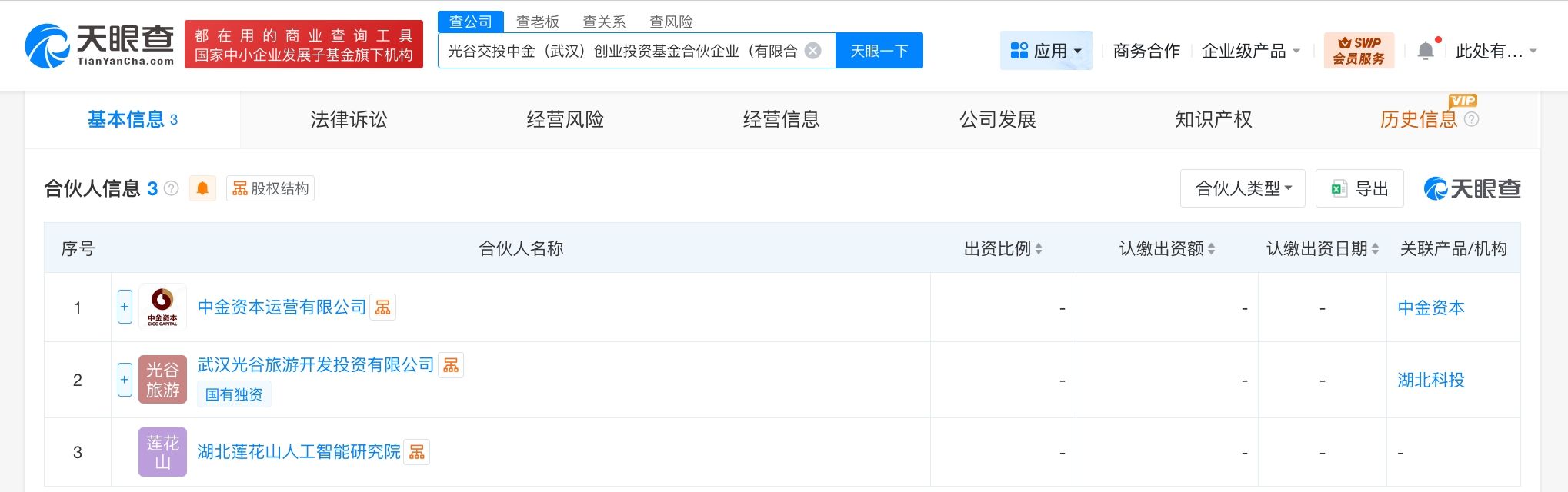 天眼查App显示,近日,光谷交投中金(武汉)创业投资基金合伙企业(有限合伙)成立,执行事务合伙人为中金资本运营有限公司,出资额20亿人民币,经营范围包括创业投资,以私募基金从事股权投资、投资管理、资产管理等活动。合伙人信息显示,该基金由中金资本运营有限公司、武汉光谷旅游开发投资有限公司、湖北莲花山人工智能研究院共同出资。