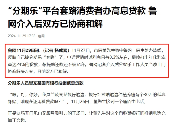 2024年11月底,山东媒体鲁网曾报道一件分期乐套路消费者办高息贷款的新闻。分期乐人员不仅冒充某国有银行推销低息贷款,等到消费者觉察自己被推销话术欺骗后,发现利息过高想还款却没有“操作通道”。