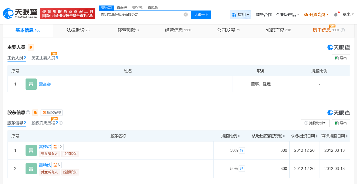 天眼查App显示,近日,罗马仕关联公司深圳罗马仕科技有限公司发生工商变更,雷社杏卸任法定代表人、董事、经理,由雷杏容接任。
