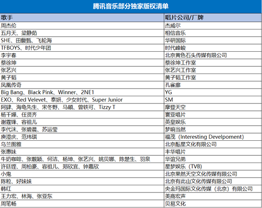 而这一回,腾讯音乐“独享”周杰伦的日子,只剩最后30天。除了周杰伦,目前,腾讯音乐还拥有五月天、SHE、TFBOYS、蔡徐坤、张艺兴、李宇春等大量华语乐坛头部艺人,以及Big Bang、Black Pink、EXO、少女时代、Red Velvet等韩语音乐头部艺人的独家音乐版权。