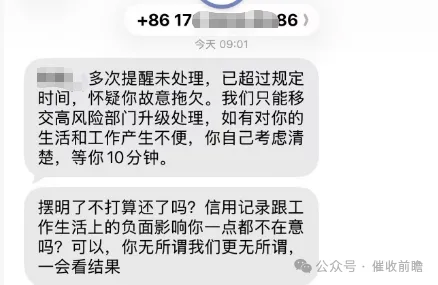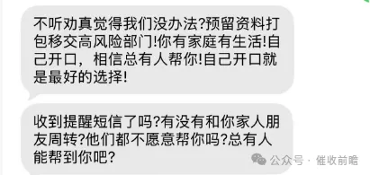 从陈先生提供的聊天记录与短信截图中可以清晰看到,催收人员在未与陈先生进行有效沟通的情况下,直接指责其 “故意拖欠”,扬言将其预留资料打包移交高风险部门升级处理,还直言 “如有对你的生活和工作产生不便,你自己考虑清楚”,并仅给陈先生 10 分钟的考虑时间。不仅如此,催收人员还不断向陈先生施压,反复提及逾期将对其信用记录、工作生活产生负面影响,甚至无端揣测其家庭经济状况,质问 “我方这边多少也了解你家压根不困难,是不是我们不给你压力你一点都无所谓是吗?”