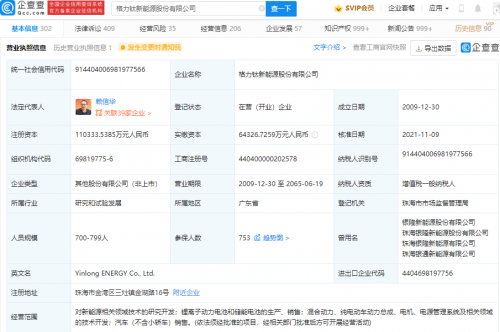 银隆新能源更名为格力钛新能源,企查查显示此前已被格力电器收购快讯