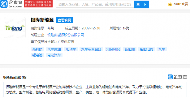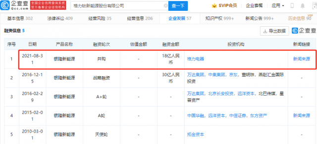 企查查信息显示,银隆新能源是一个专注于新能源产业的高新技术企业,公司成立于2009年,法定代表人为赖信华,注册资本11.03亿元人民币,经营范围包含:锂离子动力电池和储能电池的生产、销售等。企查查融资信息显示,8月31日,银隆新能源被格力电器(000651)收购,金额18亿人民币。