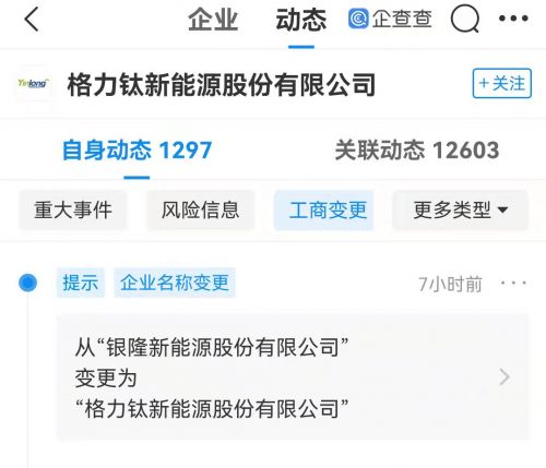 【TechWeb】企查查APP显示,11月9日,原银隆新能源股份有限公司发生工商变更,企业名称变更为格力钛新能源股份有限公司。