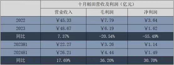 尽管2024年上半年十月稻田营收26.21亿元,同比增长17.69%,净利润也一改亏损态势达到1.49亿元,但公司市值却在一年内“缩水”一半有余。曾经的“粮仓贵族”,为何陷入了“数字亮眼,市值失色”的怪圈?