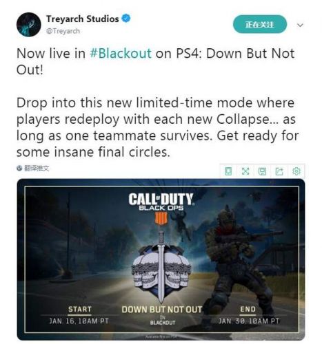 日前,我们报道了《使命召唤15:黑色行动4》吃鸡模式开启7天免费试玩,并且是全平台开放。随后不久,游戏开发商T组发布了新的公告,介绍了大逃杀模式中的新玩法“Down But Not Out”,在该模式中,死透的玩家也可复活再战,颇为神奇。不过该玩法现在仅登陆PS4,其他平台将陆续推出。