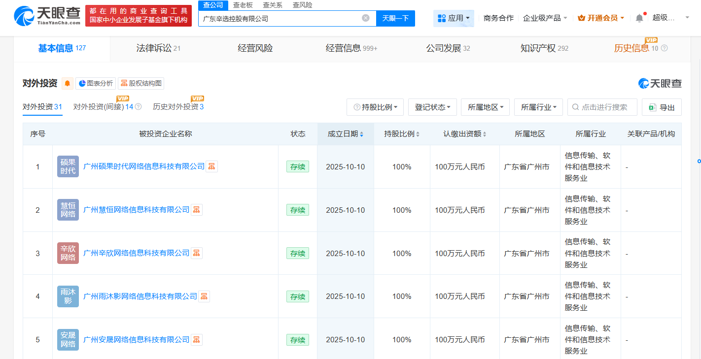 天眼查工商信息显示,近日,广州硕果时代网络信息科技有限公司、广州慧恒网络信息科技有限公司、广州辛欣网络信息科技有限公司、广州雨沐影网络信息科技有限公司、广州安晟网络信息科技有限公司成立,法定代表人均为计梦瑶,注册资本均为100万人民币,经营范围包括卫生用品和一次性使用医疗用品销售、母婴用品销售、个人卫生用品销售等。股东信息显示,上述公司均由广东辛选控股有限公司全资持股。