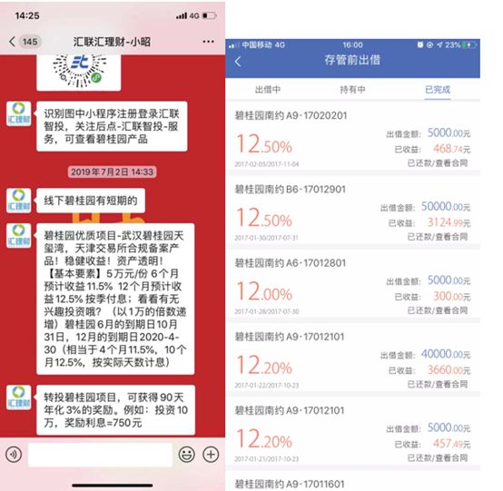 自媒体地产透视的报道也显示,汇联汇理财曾多次推介碧桂园项目,6个月预期收益率达到11.5%。