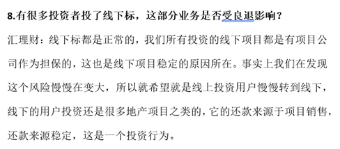 有意思的是,上述谈话纪要还显示,汇理财的部分项目投资是通过线下渠道进行的。而央行、银保监会曾多次警示线下理财模式的非法集资等风险问题。