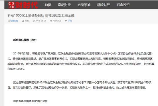 该报道还称,2015年7月28日,碧桂园宣布联合汇联金融,以股权收购的方式获取位于深圳坂田中心片区坂雪岗大道和中兴路交会处的两个新地块。