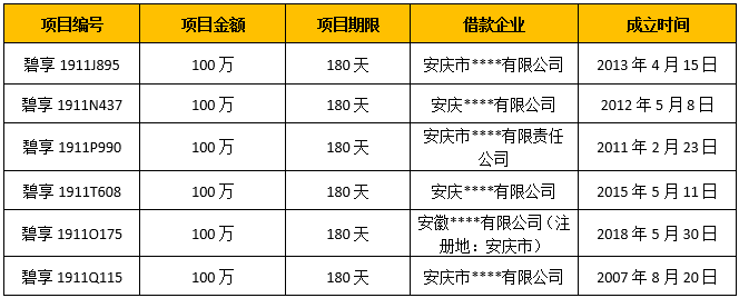 无独有偶,探长读财发现,碧有贷首页展示的18个借款项目中,6个借款企业来自安徽省安庆市,且借款金额均为100万元,项目期限180天,成立时间最早的2007年8月份,最晚的2018年5月份。