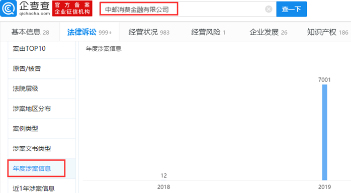 与中银消金一样,中邮消金在聚投诉也只有751件投诉,涉及问题也主要集中爆通讯录。涉案文书信息显示,中邮消金2019年(前三季度)裁判文书7001篇,而2018年累计裁判文书仅12篇。