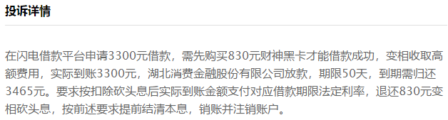互金商业评论注意到,9月4日,高先生在聚投诉发帖称,其在闪电借款(掌众金服旗下)申请借款3300元,需先购买830元财神黑卡才能借款成功,变相收取高额费用,湖北消金微放款机构,期限50天,到期需归还3465元。要求退还830元砍头息,按前述要求提前结清本息,销账并注销账户。
