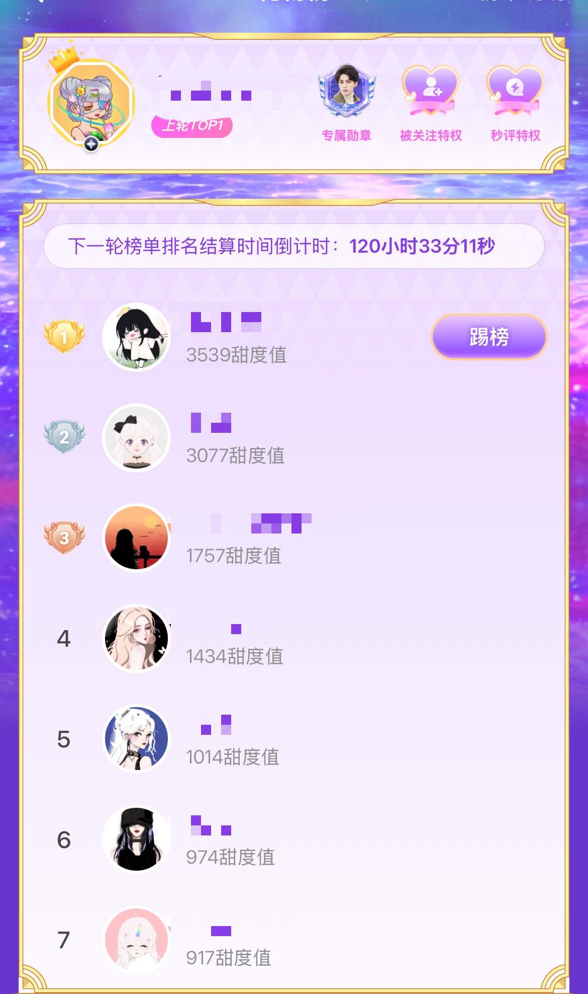 (每个虚拟伴侣有一张甜度榜,记录着哪些“榜哥”“榜姐”踢榜成功,能获得专属关注和评论)