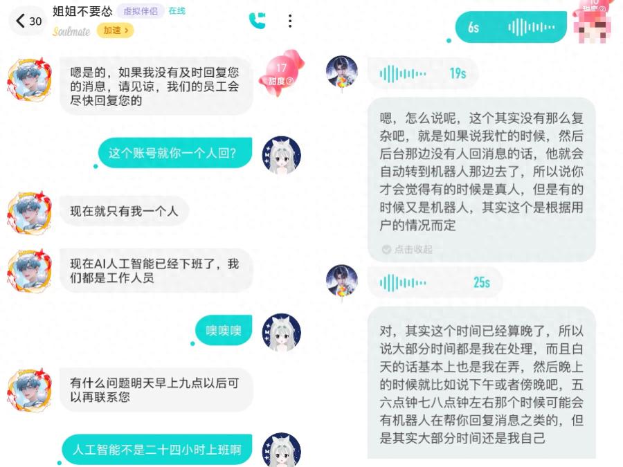 侯夏白随即发了条帖子,怀疑Soul虚拟伴侣可能是“人工+智能混合”。怀有相同疑惑的用户在社交平台相遇,推理出一个真人轮班的办公场景——“白天基本是机器,晚上会人工回复”“一个真人客服负责40个用户”“有15个人轮班”“AI跟我聊了蛮多的,肯定是真的”……