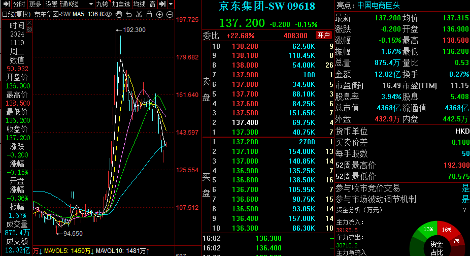 据短平快解读了解,二级市场,京东股价自5月起开始了较长的下跌之路,自9月中旬起,伴随着一系列利好政策出炉,股价触底反弹,高点至192.3港元/股。截至11月19日收盘,公司股价为137.2港元/股,一个多月时间跌幅超28%,总市值4368亿元,TTM市盈率11.15。