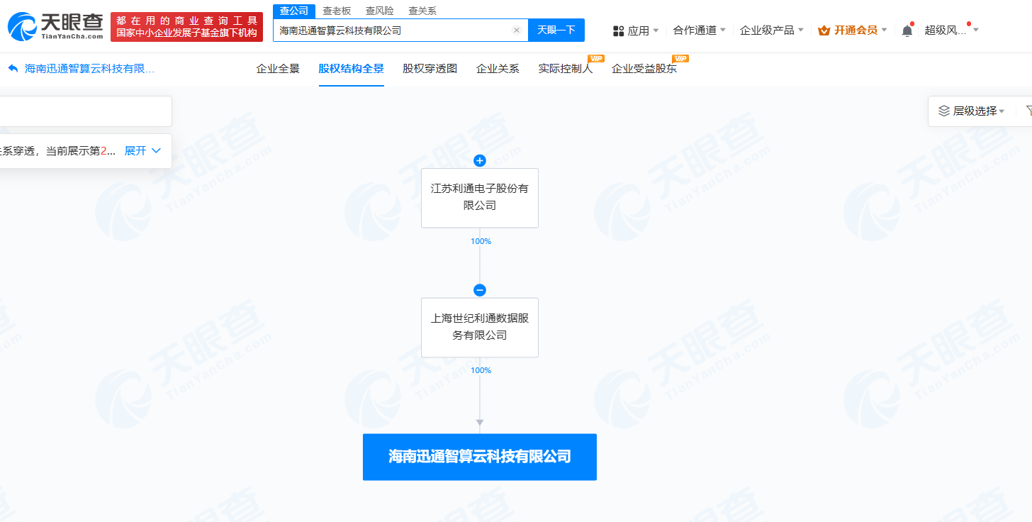 天眼查App显示,近日,海南迅通智算云科技有限公司成立,法定代表人为杨春伟,注册资本1000万人民币,经营范围包括互联网数据服务、工业互联网数据服务、大数据服务、软件开发、云计算装备技术服务、数据处理服务等。股权全景穿透图显示,该公司由利通电子(603629)旗下上海世纪利通数据服务有限公司全资持股。