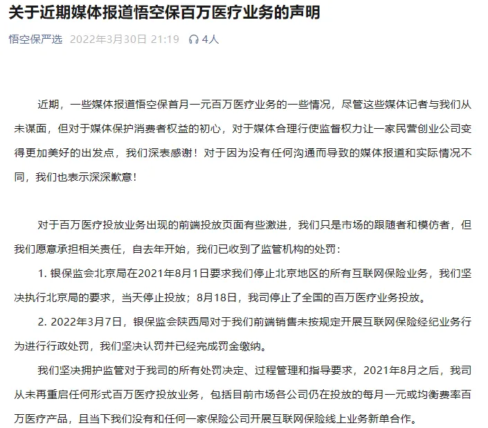 3月30日,悟空保发布声明称,自2021年开始,已收到了监管机构的处罚,2021年8月之后,从未再重启任何形式百万医疗投放业务,包括目前市场各公司仍在投放的每月一元或均衡费率百万医疗产品,且当下没有和任何一家保险公司开展互联网保险线上业务新单合作。