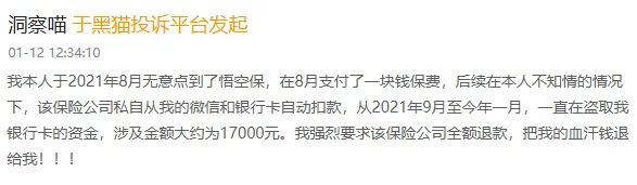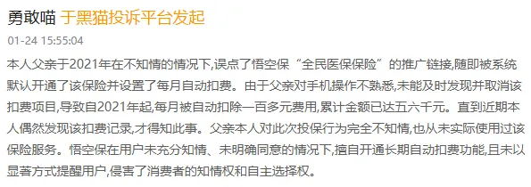 梁先生的遭遇并非孤例。黑猫投诉平台数据显示,针对悟空保的投诉量已突破万条,大量消费者控诉其“隐形扣费”问题,受害者以中老年人为主,投保时间多集中在2021年。不少人只因误点一条推广链接就“被投保”,随后陷入持续自动扣费,损失从数千元到上万元不等。