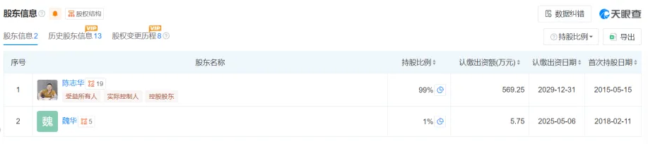 2024年4月,陈志华个人对悟空保进行增资,公司注册资本增至575万元。天眼查信息显示,目前悟空保仅有两位个人股东,持股99%的陈志华与持股1%的魏华。