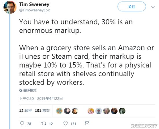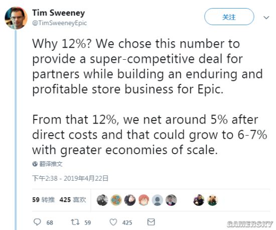 “为什么是12%?我们选择这个数字是为了给予我们的伙伴们超级有竞争力的价格,同时我们还能够让Epic商店保持运行和盈利。在这12%里,扣除直接成本后,我们的净利润大概是5%,商业规模更大的话可能会提升到6-7%。”