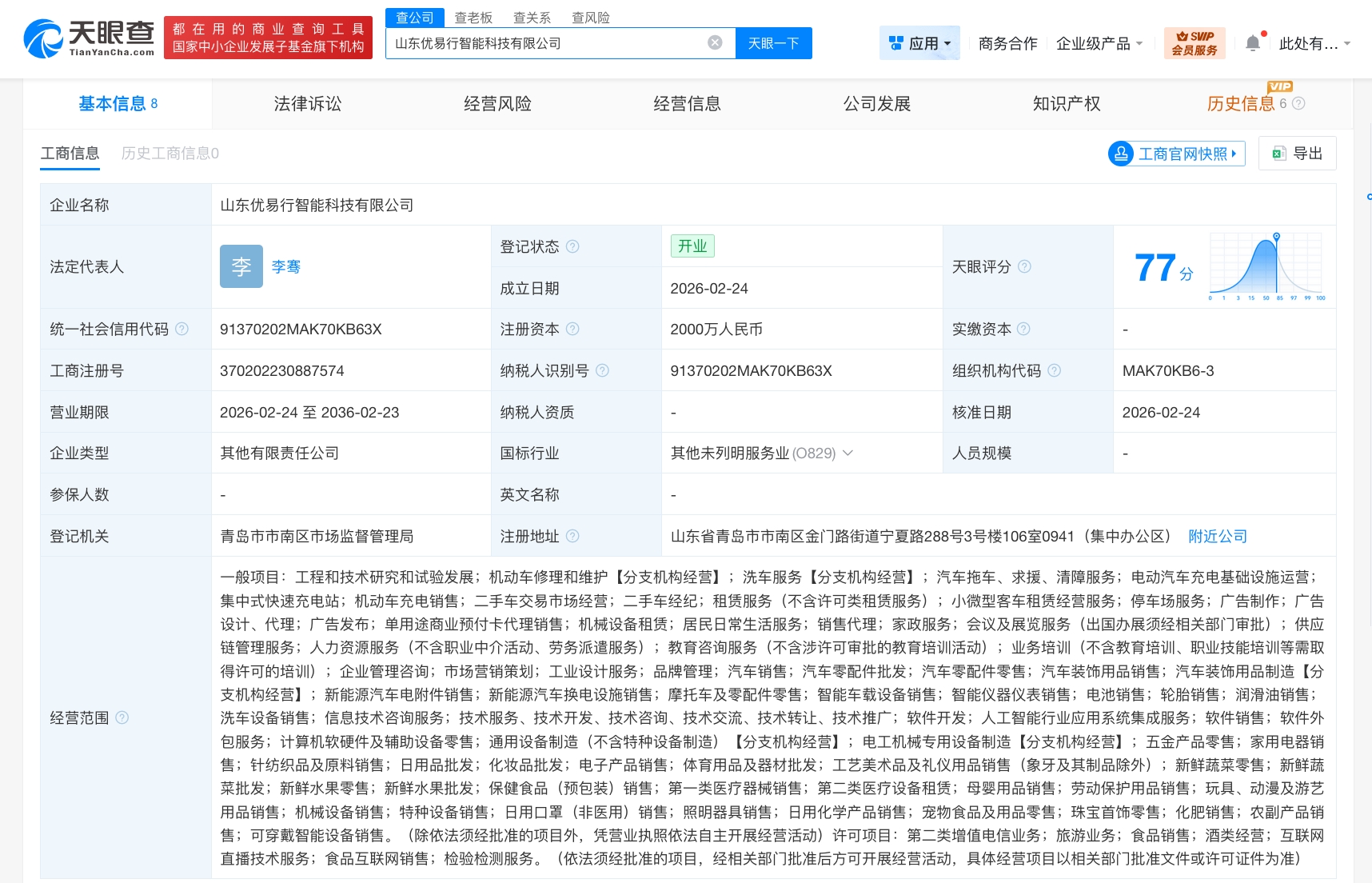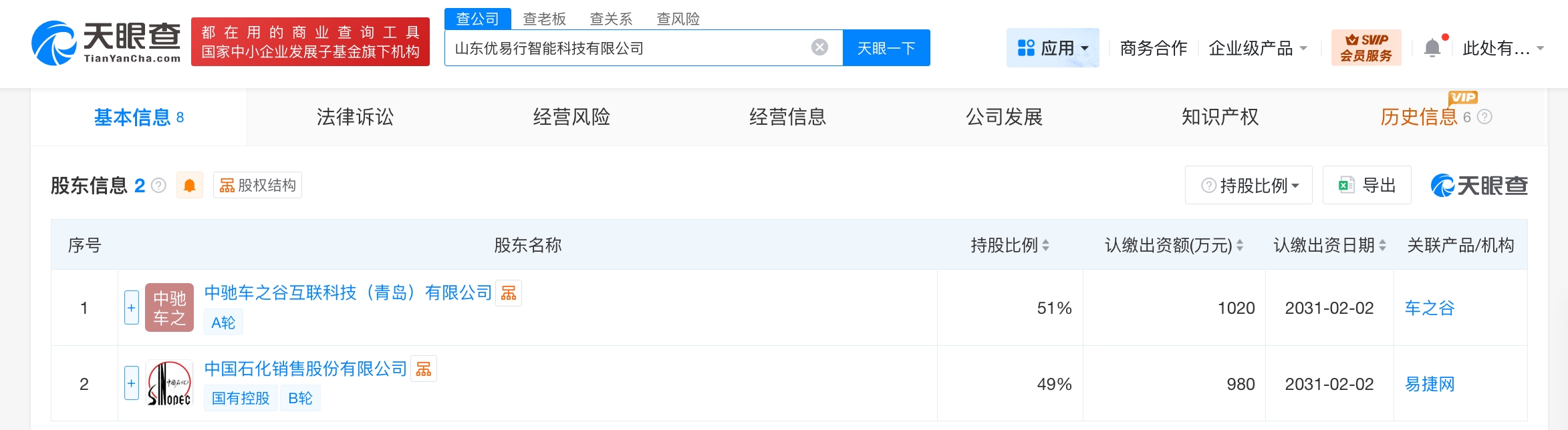天眼查App显示,近日,山东优易行智能科技有限公司成立,法定代表人为李骞,注册资本2000万人民币,经营范围含工程和技术研究和试验发展、机动车修理和维护、电动汽车充电基础设施运营、集中式快速充电站、机动车充电销售、二手车经纪、租赁服务、供应链管理服务、人力资源服务、市场营销策划等,由中驰车之谷互联科技(青岛)有限公司、中国石化销售股份有限公司分别持股51%、49%。
