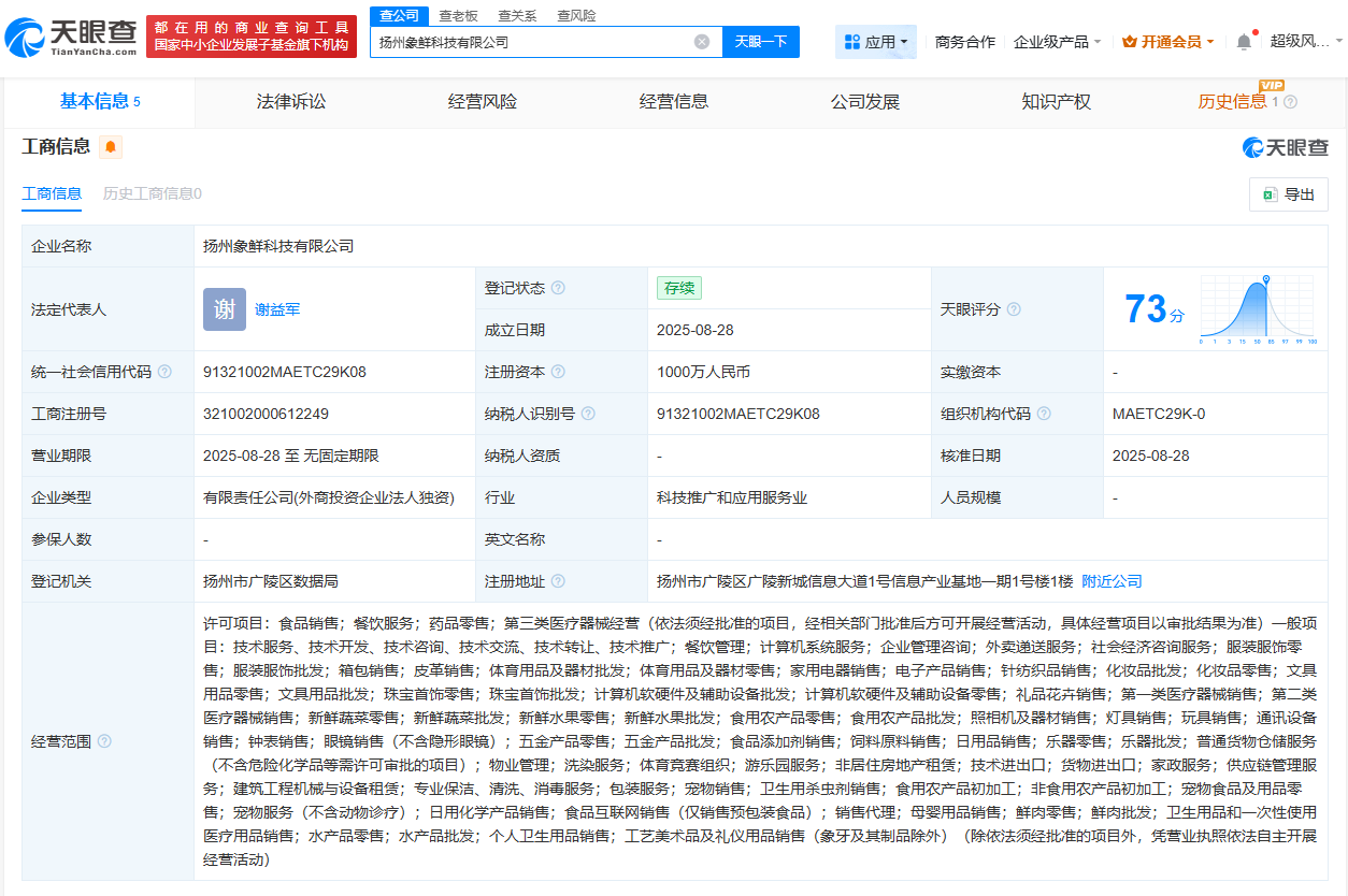 天眼查App显示,近日,扬州象鲜科技有限公司成立,法定代表人为谢益军,注册资本1000万人民币,经营范围包括餐饮管理、外卖递送服务、社会经济咨询服务等。股东信息显示,该公司由小象超市关联公司北京象鲜科技有限公司全资持股。