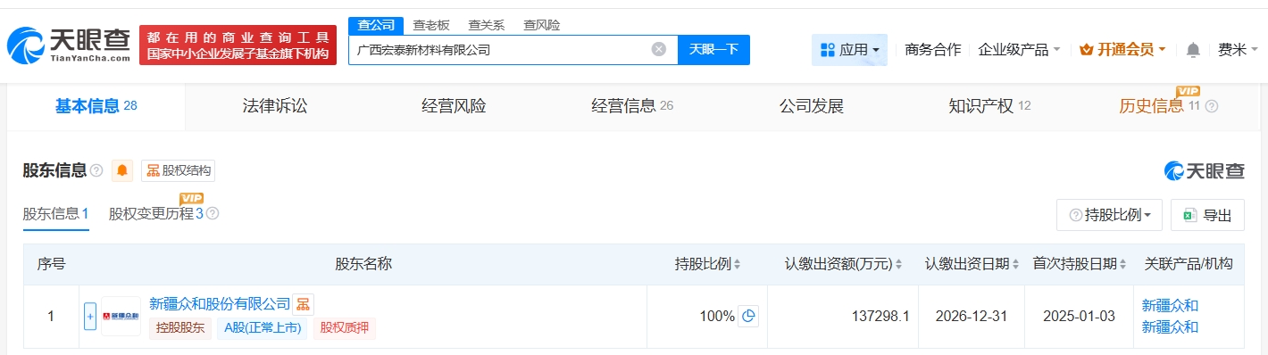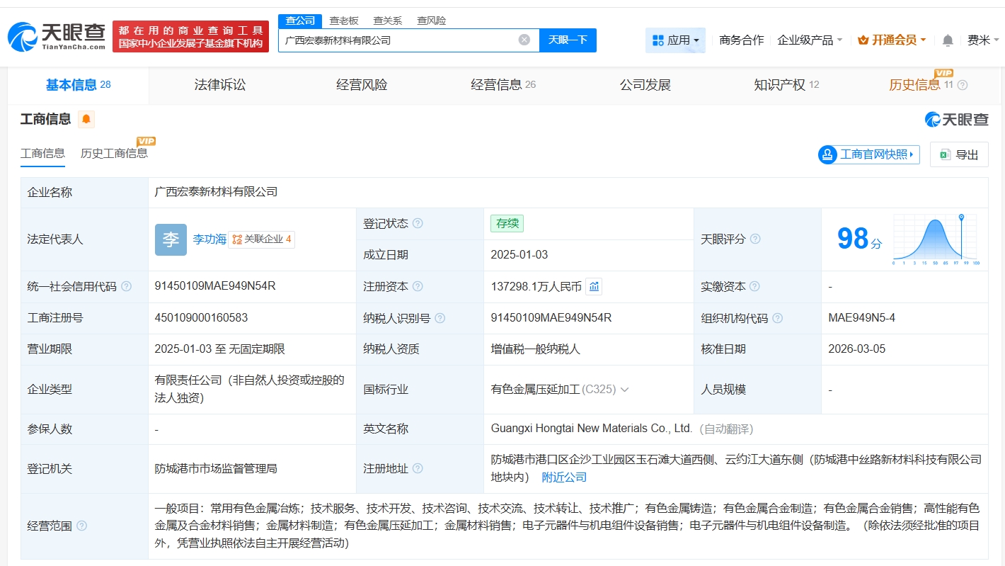 广西宏泰新材料有限公司成立于2025年1月,法定代表人为李功海,经营范围包括常用有色金属冶炼、有色金属合金制造、有色金属压延加工等。股东信息显示,该公司由新疆众和(600888)全资持股。
