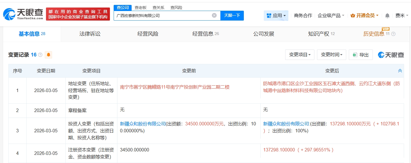天眼查App显示,近日,广西宏泰新材料有限公司发生工商变更,注册资本由3.45亿人民币增至约13.7亿人民币,增幅约298%。