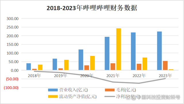 尽管亏损有所好转,但哔哩哔哩如今依旧面临盈利挑战。从2018年美股上市以来,尽管营收保持着增长,哔哩哔哩却始终处于亏损状态,2022年度,哔哩哔哩净亏损达到75.08亿元。从流动性来看,哔哩哔哩流动资产净值从2021年开始不断下降,到2023年,只有6.23亿元。