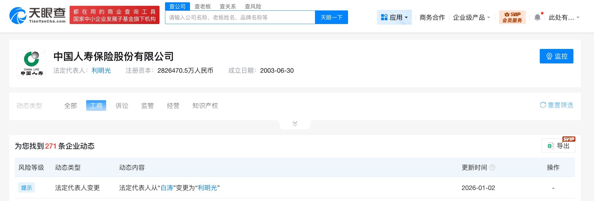天眼查工商信息显示,近日,中国人寿(601628)发生工商变更,白涛卸任法定代表人,由利明光接任。