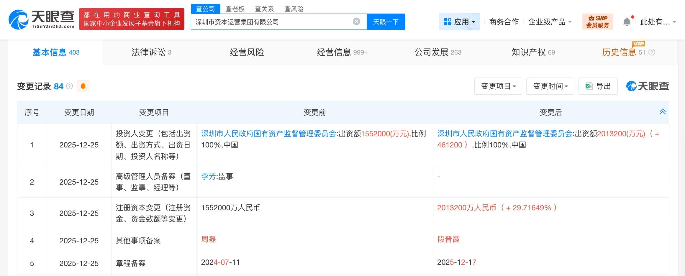天眼查App显示,近日,深圳市资本运营集团有限公司发生工商变更,注册资本由155.2亿人民币增至约201.3亿人民币,增幅约30%。