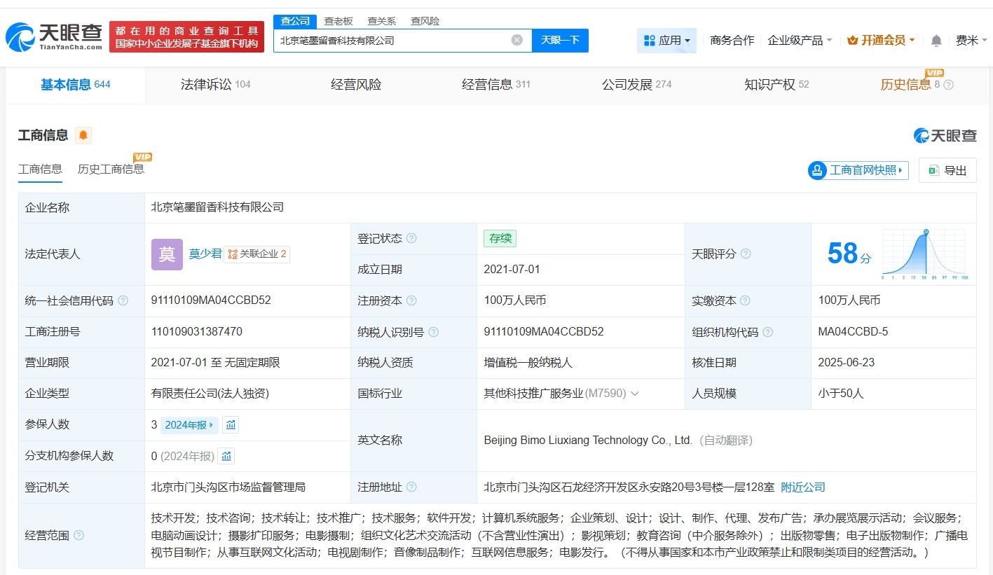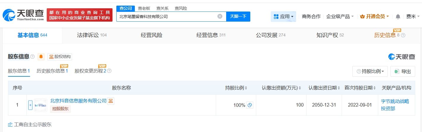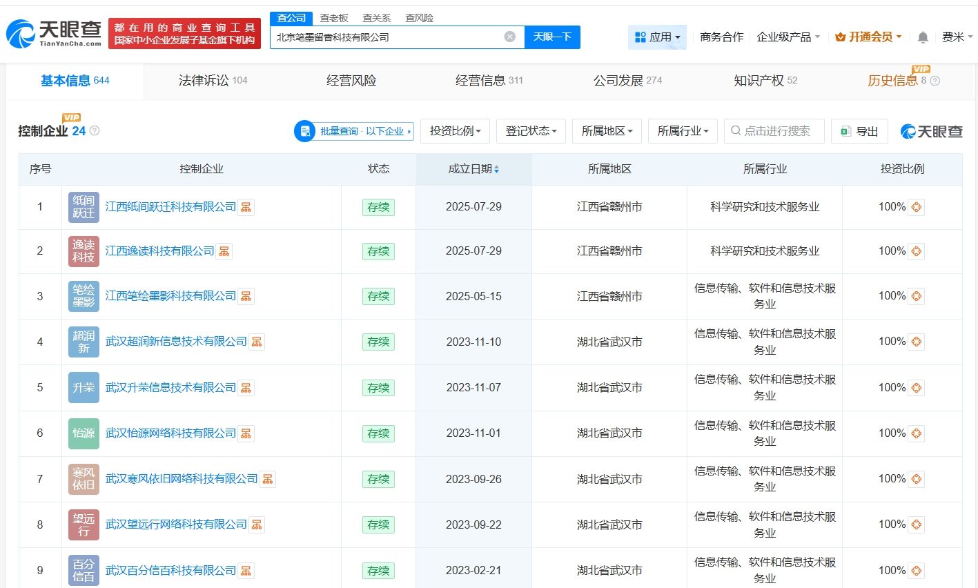 天眼查App显示,红果短剧关联公司北京笔墨留香科技有限公司成立于2021年7月,法定代表人为莫少君,注册资本100万人民币,经营范围包括广播电视节目制作、电视剧制作、电影摄制等。股东信息显示,该公司由北京抖音信息服务有限公司全资持股。控制企业信息显示,该公司控制20余家企业,去年5月和7月,该公司成立了江西纸间跃迁科技有限公司、江西逸读科技有限公司、江西笔绘墨影科技有限公司。