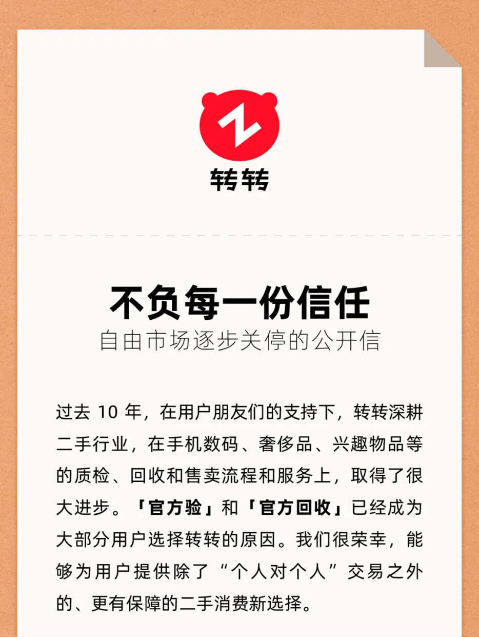 这边闲鱼忙着“割韭菜”,那边转转却早已“掀桌子”——2025年10月,转转宣布逐步关停自由市场(C2C业务),全面转向“官方验”的C2B2C模式(个人-平台-个人)。