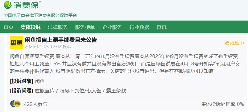 近日,闲鱼爆出将于4月18日将鱼小铺手续费从0.6%上调至1.6%,涨幅达167%;此举在消费保平台引发投诉潮。