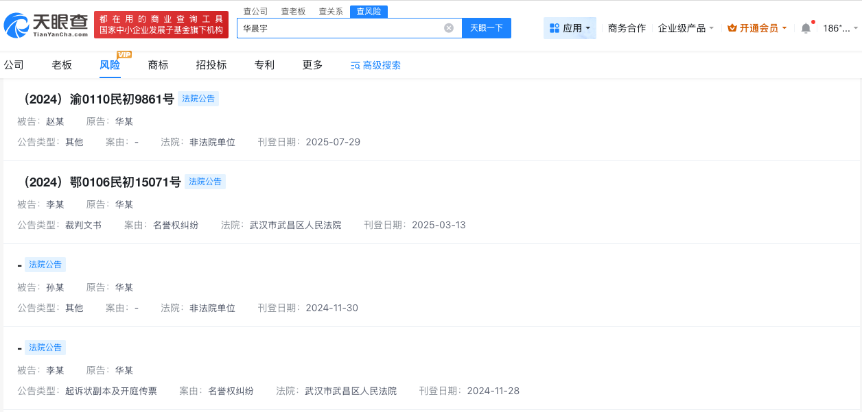 天眼查法律诉讼信息显示,近期,华晨宇已多次发起网络侵权责任纠纷、名誉权纠纷,被告涉及多个公司及自然人。其中,2025年10月,李某因未按指定期间履行生效法律文书确定的给付义务被限制高消费,涉及与华晨宇相关名誉权纠纷一案。2025年7月,赵某曾向华晨宇公开致歉。