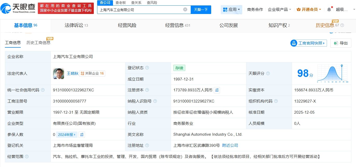 天眼查App显示,近日,上海汽车工业有限公司发生工商变更,注册资本由约15.67亿人民币增至约17.38亿人民币,增幅约10.9%。