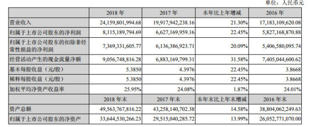 而在4月29日,洋河股份也发布2018年年度业绩报告,报告显示,洋河实现营收241.60亿元,同比增长21.30%;归属上市公司股东净利润81.15亿元,同比增长22.45%。