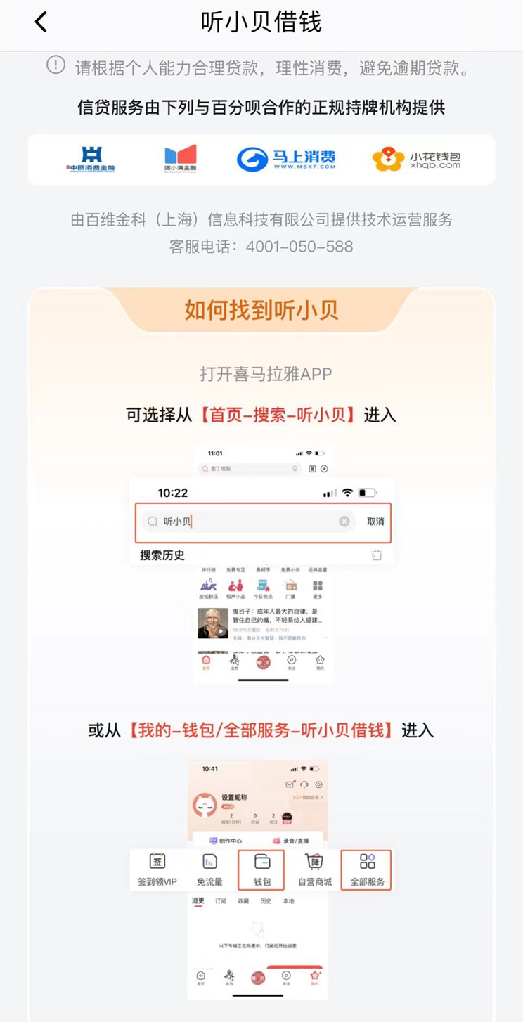 尽管在喜马拉雅APP的“钱包”功能中也能找到“听小贝借钱”的入口,但喜马拉雅却选择将其单独列出,作为一项独立的服务功能,就不难看出喜马拉雅对金融业务的重视程度。