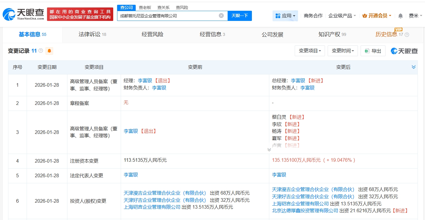 天眼查App显示,近日,成都普托尼亚企业管理有限公司发生工商变更,新增王思聪名下北京达德厚鑫投资管理有限公司为股东,同时注册资本由约113.5万人民币增至约135.1万人民币。