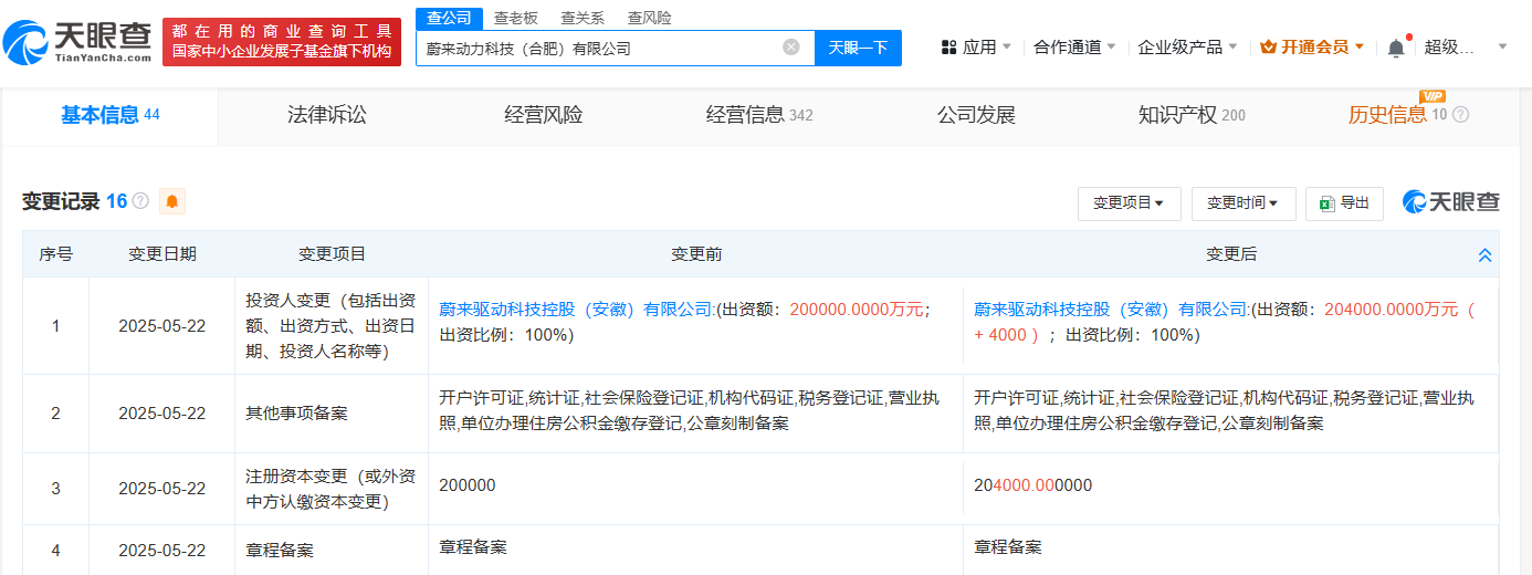 天眼查App显示,近日,蔚来动力科技(合肥)有限公司发生工商变更,注册资本由20亿人民币增至20.4亿人民币。