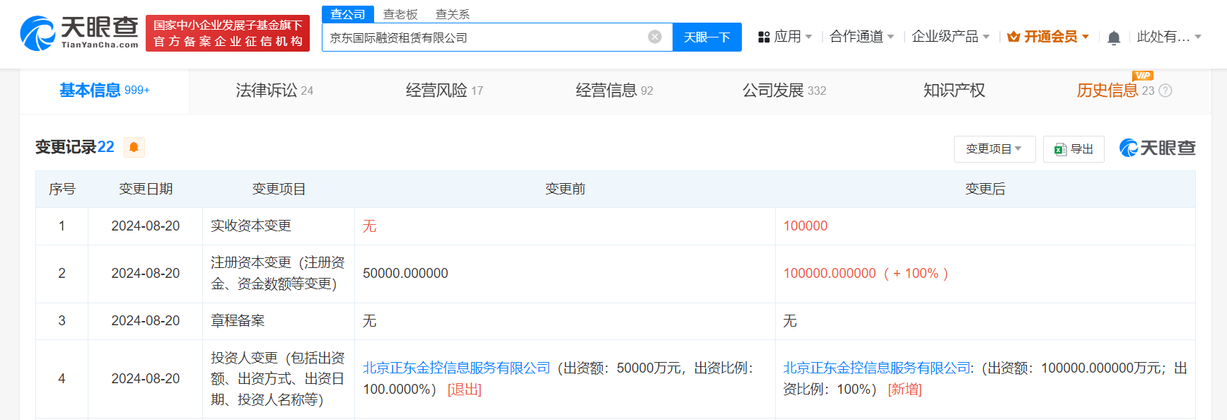 天眼查App显示,近日,京东国际融资租赁有限公司发生工商变更,注册资本由5亿人民币增至10亿人民币。