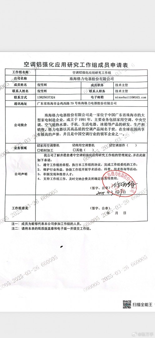 针对朱磊的喊话,4月15日上午,海信高管@杨万手 公开作出回应,仅用“又当又立”四字表达态度,语气强硬,同时晒出一张《空调铝强化应用研究工作组成员申请表》的扫描件,该申请表显示,格力电器为该工作组成员单位,以此反驳格力的立场言论。