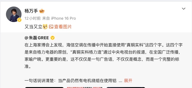 起因是4月14日晚间,格力电器CMO朱磊率先在社交平台发文,明确指出在上海家博会上发现海信空调在传播过程中,直接使用“真铜实料”四字,而这一表述为格力电器原创。朱磊强调,“真铜实料格力造”经过中央电视台报道,已在全国广泛传播、家喻户晓,更重要的是,这一表述并非单纯的广告语,而是一套完整的产品品质标准。