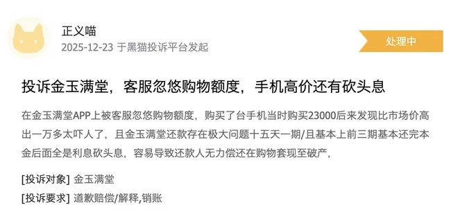 对于消费者的投诉公司如何回应?平台是否存在通过商品溢价把真实借贷成本转嫁给消费者的情况?就相关问题记者尝试联系金玉满堂方面。