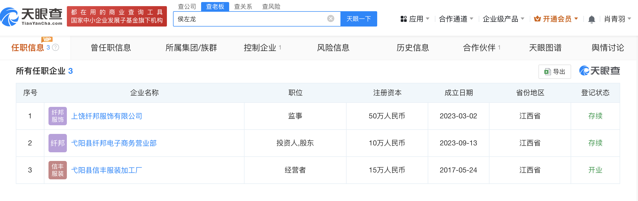 值得注意的是,除弋阳县信丰服装加工厂外,侯左龙名下还关联2家存续公司,为上饶纤邦服饰有限公司、弋阳县纤邦电子商务营业部。上述3家公司经营范围包含服装制造、服装服饰批发、服装服饰加工服务等,侯左龙在其中担任监事、经营者等。