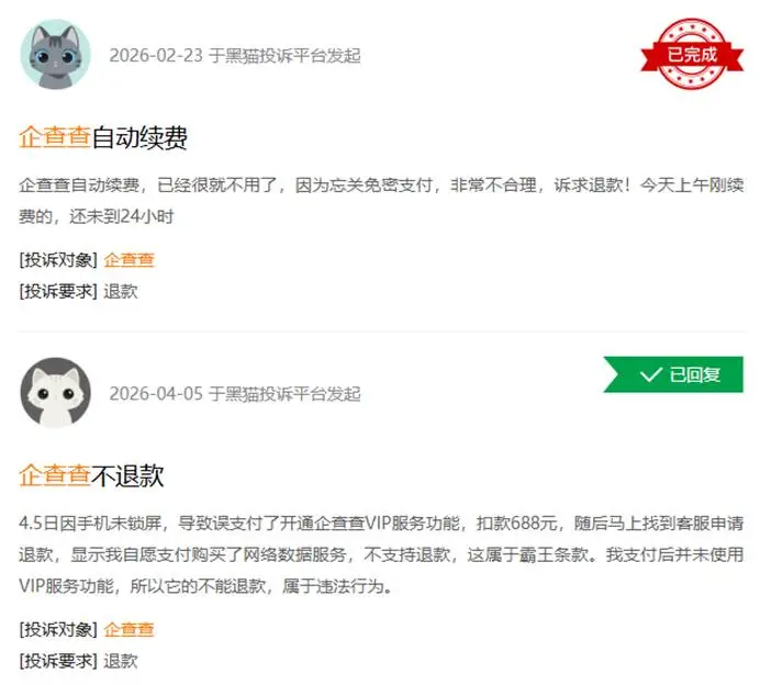 另外,在黑猫投诉等平台中,有关企查查“诱导消费”、“自动续费陷阱”以及“数据更新不及时造成误判”的投诉络绎不绝。黑猫平台上,一名用户表示:企查查自动续费,已经很久没有使用了,因为忘了关闭免密支付功能,很不合理,要求退款!今天上午才续费的,还没有到24小时。
