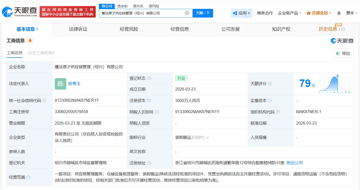 魔法原子在绍兴成立供应链管理公司 注册资本3000万观点
