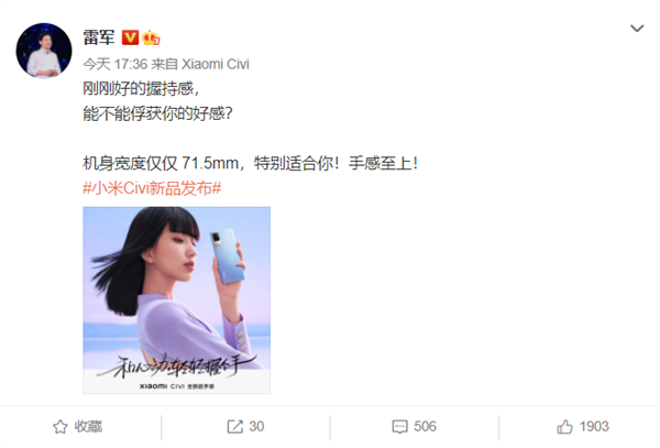 Xiaomi Civi即将发布 雷军:宽度仅71.5mm 刚刚好的握持感快报